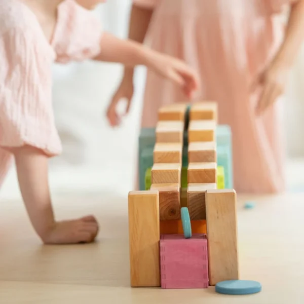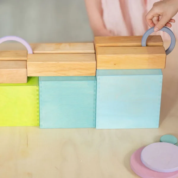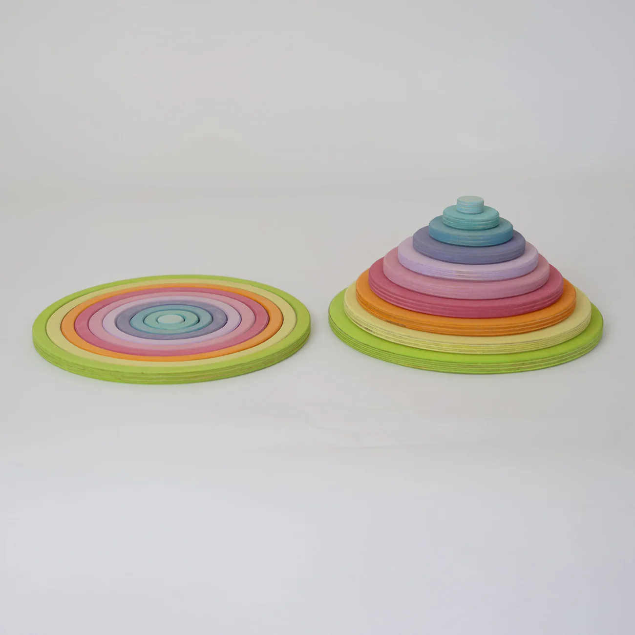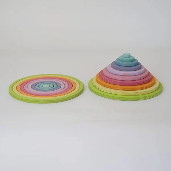 Ten circles and ten rings in different sizes and colours invite you to have lots of fun building and playing. With a love of experimentation and a sure instinct, balance games, airy buildings and multifunctional platforms can be created. 20 pieces. Wood: 11mm, birch plywood, varnished in colour. Dimensions: Diameter 2-20cm.