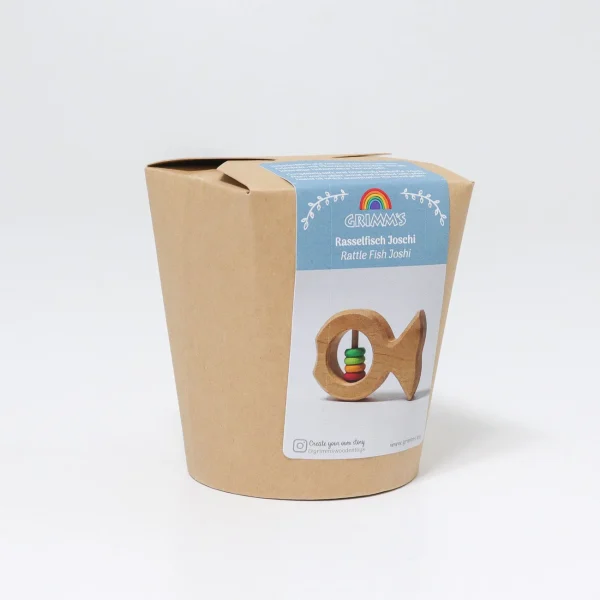 Rattle Fish with four multicoloured wooden discs in red and green.